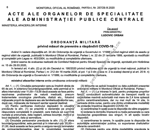 În data de 26.03.2020 Guvernul României a emis un nou model al adeverinței. Documentul poate fi descărcat de aici, existând posibilitatea completării electronice a acestuia, tipărirea fiind necesară pentru a putea fi semnat. *** Având în vedere dispozițiile art. 5 din Ordonanța militară nr. 2/2020, redăm în continuare conținutul agreat de autorități în ceea ceContinuă lectura „Model adeverință pentru justificarea deplasării în temeiul Ordonanței Militare nr. 2/2020. UPDATE: nou model emis de Guvernul României”